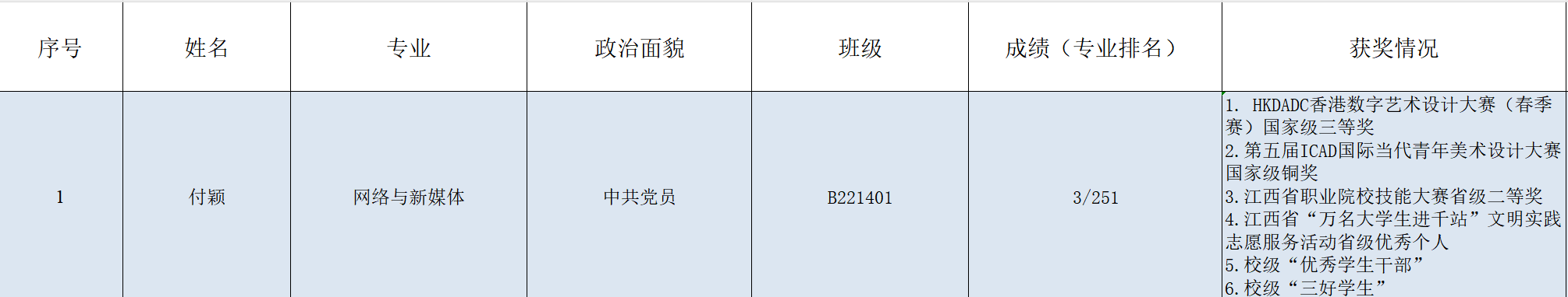依据《江西软件职业技术大学关于组织评审2024-2025学年“先锋奖学金”的通知》(江软校发〔2025〕107 号)文件精神,经本人申请,班级推荐,学院初审,学院“先锋奖学金”评审领导小组审批,现将新媒体学院拟获得“先锋奖学金”侯选人有关情况予以公示: