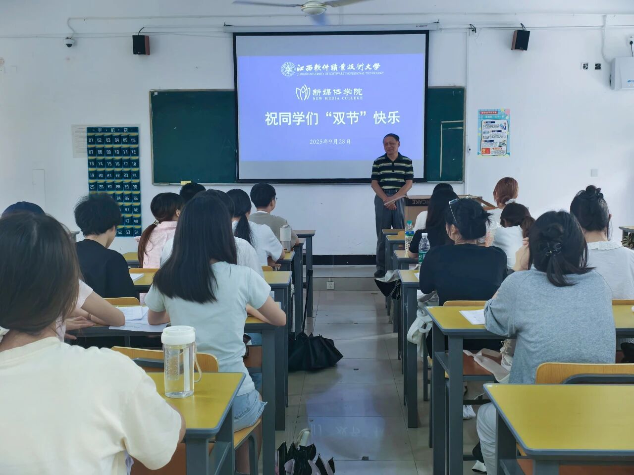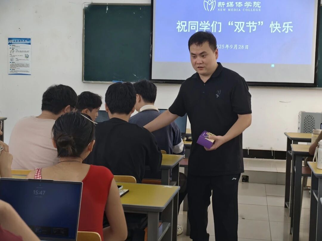 金秋送爽,丹桂飘香。在中秋、国庆双节来临之际,为传递学校对学子的关怀与祝福,9月28日下午,学校党委副书记高建国走进新媒体学院教室,为同学们送上学校专门订制的中秋月饼,祝福祖国繁荣富强,并围绕安全防护、假期生活等内容与同学们交流互动,使同学们感受到家的温暖。