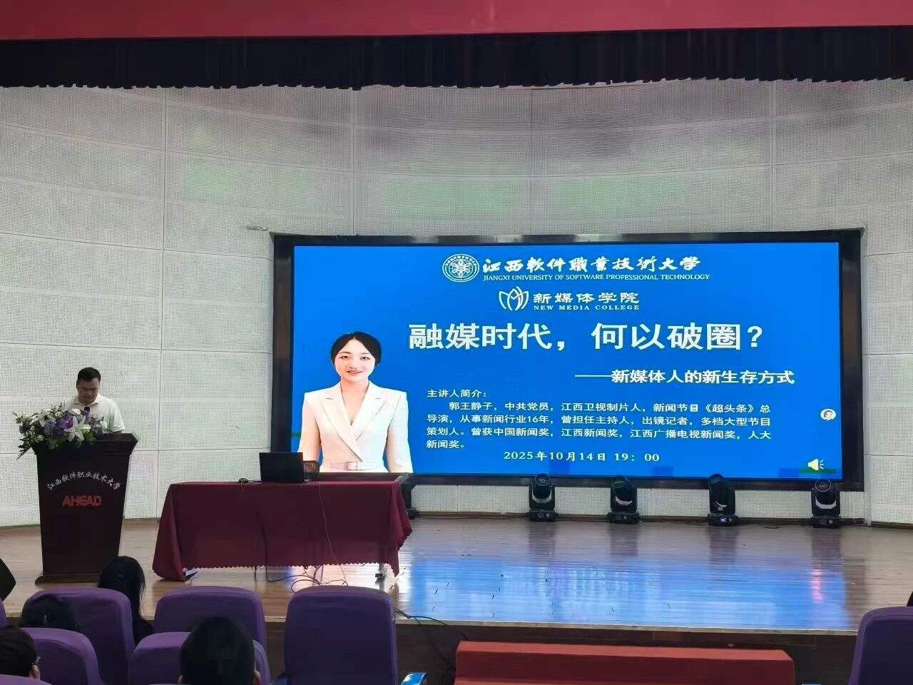 10月14日晚,2024、2025级全体同学齐聚学术报告厅,共同聆听了江西卫视制片人、《超头条》总导演郭王静子带来的专题讲座——“融媒时代,何以破圈?——媒体人的新生存法则”。讲座系统解析了在媒体融合背景下,媒体人如何实现突破与成长。