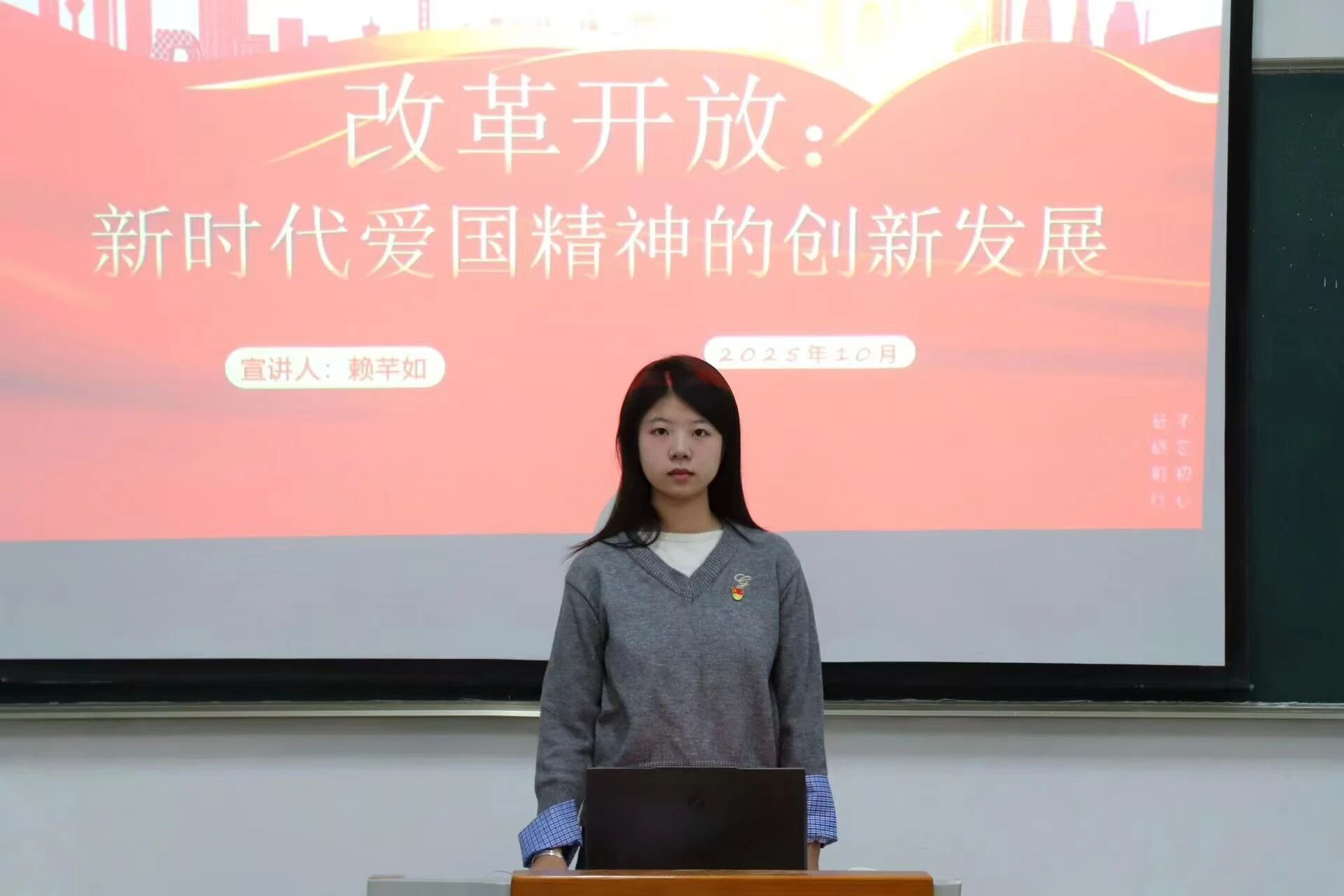 为推进青年思想政治教育走深走实,引导新生理解改革开放精神与新时代爱国情怀,10月22日,新媒体学院学生党支部于A11-308教室开展 “改革开放:新时代爱国精神的创新发展” 学生微党课分享,此次微党课学生党员赖芊如同学进行分享。