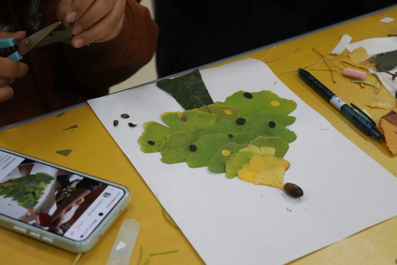 室内创作阶段,教室内化身充满创意的“美育工坊”。各小组围绕“自然之美”“环保主题”等方向展开构思,将采集来的树叶进行清洗、压平、修剪等处理,并运用剪刀、胶水、卡纸等工具进行创作。同学们充分发挥想象力与审美能力,通过巧妙的构图与色彩搭配,将一片片平凡的落叶转化为一幅幅生动的树叶画、精致的标本或富有创意的立体造型。