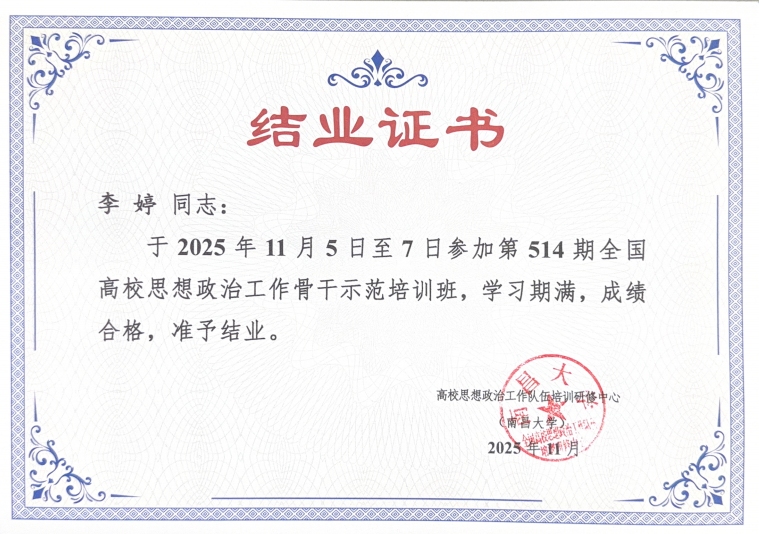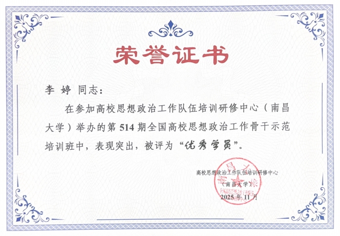 2025年11月4日至7日,由教育部思想政治工作司主办、全国高校思想政治工作队伍培训研修中心(南昌大学)承办的第514期全国高校思想政治工作骨干示范培训班在江西南昌举行。来自部属高校、部省合建高校及各省属高校的103名思政工作骨干参加培训,我院辅导员李婷应邀参训。