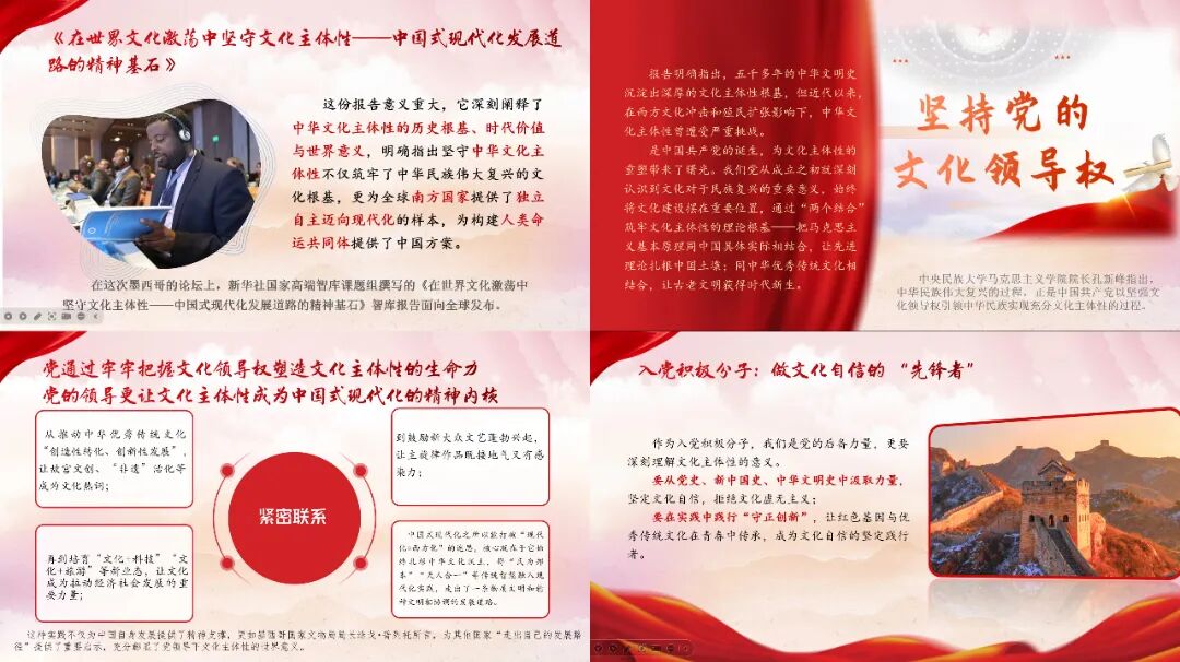 学习中,入党积极分子深刻认识到,作为党的后备力量,需坚定文化自信,拒绝文化虚无主义,践行“守正创新”;新媒体专业学员更明确要以专业所长,通过短视频、文创设计等方式传播中华文化,让传统焕新、让互鉴故事远传。